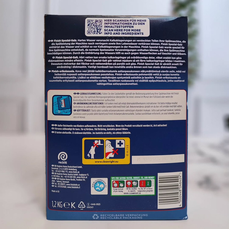 نمک ماشین ظرفشویی فینیش ساخت آلمان با ۹۹.۹ درصد خلوص می باشد. علت نمک ماشین ظرفشویی فینیش استفاده از آن برای مناطق دارای آب سخت می باشد. خلوص این نمک ظرفشویی تضمین می کند که نرم کننده آب داخلی ماشین ظرفشویی شما به طور موثر کار میکند و از ماشین ظرفشویی شما در برابر رسوب آهک محافظت می کند. همچنین به محافظت از لکه ها و نوشته های داخل ظروف شیشه ای شما کمک می کند.